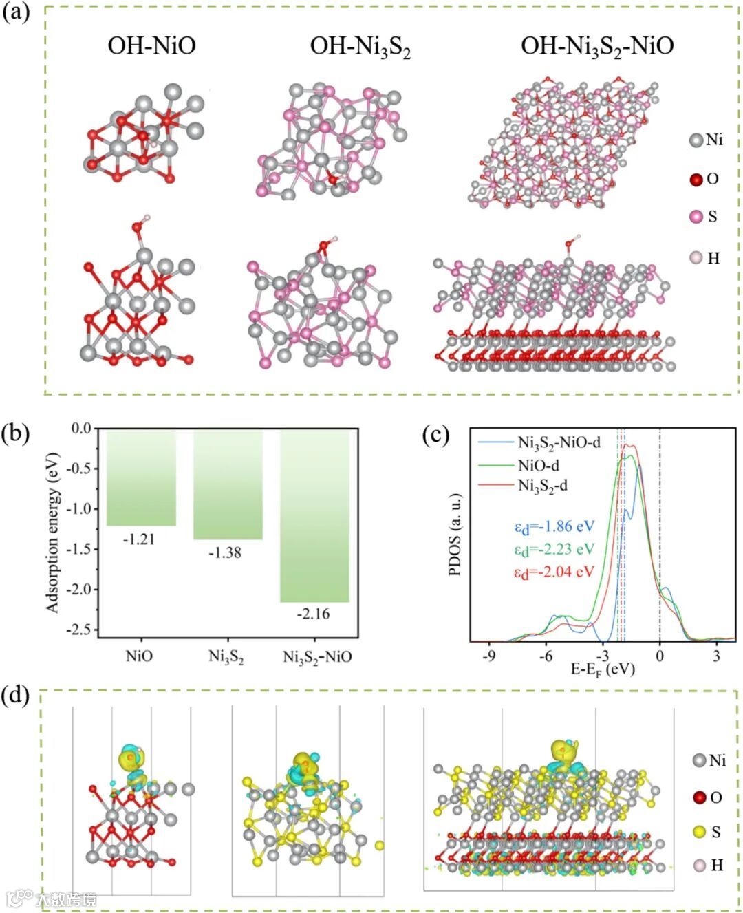 通过密度泛函理论(DFT)计算分析了NiO、Ni₃S₂和Ni₃S₂-NiO异质结构的性能增强机制。计算结果表明,Ni₃S₂-NiO异质结构对OH⁻的吸附能最高(-2.16eV),表明其具有更强的OH⁻吸附能力和更高的电导率。部分态密度(PDOS)分析进一步揭示了Ni₃S₂-NiO的d带中心更接近费米能级,这有助于促进电子的吸附和传输。