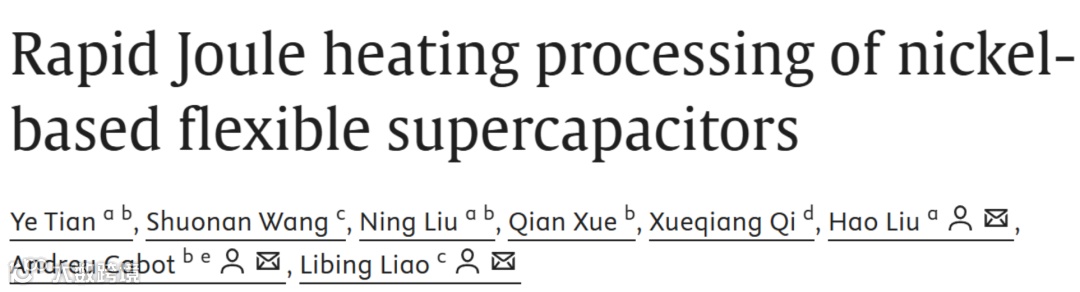 超级电容器因其快速充放电能力、高功率密度和超长循环寿命,在可穿戴电子设备领域备受关注,但传统电极制备方法存在诸多限制,如低孔隙率、厚重的金属支撑材料以及粘结剂的使用,这些都影响了电极性能。因此,开发高效、环保且成本低廉的新方法成为研究热点。2025年2月17日,中国地质大学廖立兵教授、刘昊教授及西班牙加泰罗尼亚能源研究所(IREC)Andreu Cabot教授等在《Chemical Engineering Journal》期刊发表研究论文,提出了一种超快速焦耳热法,成功在碳纳米管基底上合成了镍硫化物和镍氧化物纳米颗粒(Ni₃S₂-NiO@BP),并将其应用于高性能柔性超级电容器电极材料。该方法通过快速热冲击处理,显著提升了材料的电化学性能,展现出高达2278 F/g的比电容和优异的循环稳定性。