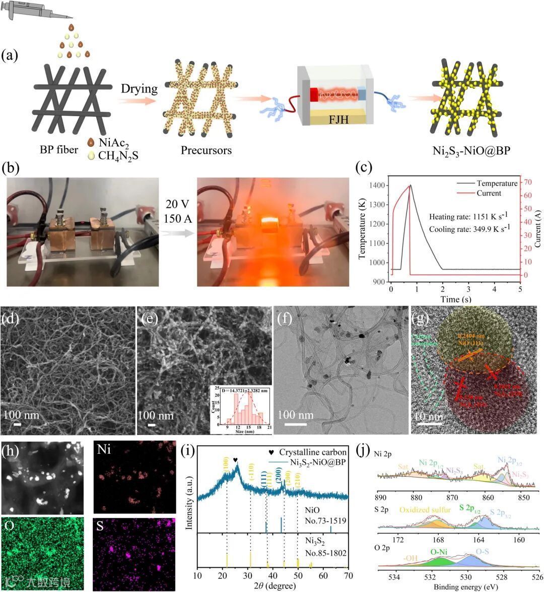 图1展示了Ni₃S₂-NiO@BP电极材料的制备过程及其微观结构。通过示意图清晰地描述了从BP浸泡硫脲和醋酸镍前驱体溶液,到通过真空环境下的焦耳热冲击处理合成最终材料的全过程。焦耳热法通过电流快速加热材料,避免了传统化学气相沉积中需要使用化学气体的步骤。光学图像和温度变化曲线表明,在20V的热冲击电压下,材料可在750毫秒内迅速升温至1400K,随后快速冷却。这种快速的热处理方式能够有效抑制晶体生长和颗粒团聚,同时保留BP的管状结构。