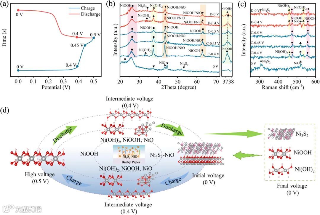 通过原位X射线衍射(XRD)和拉曼光谱分析了Ni₃S₂-NiO@BP在充放电过程中的结构演变。研究发现,随着电压的升高,Ni₃S₂逐渐转化为Ni(OH)₂和NiOOH,而在放电过程中,NiOOH又还原为Ni(OH)₂、NiO和Ni₃S₂。这一过程表明,Ni₃S₂-NiO@BP的电荷存储机制主要依赖于Ni²⁺和Ni³⁺之间的氧化还原反应。