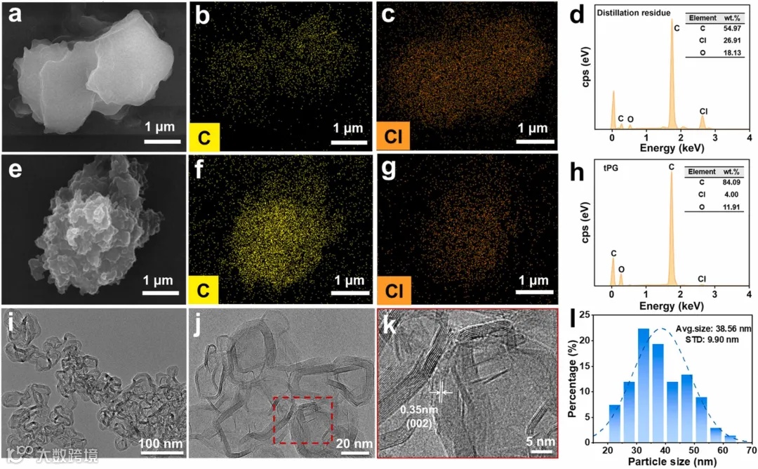 图4展示了扫描电子显微镜(SEM)和透射电子显微镜(TEM)图像,揭示了tPG的折叠、堆叠及高度结晶的片状形态,进一步验证了其在电磁波吸收中的优越性。