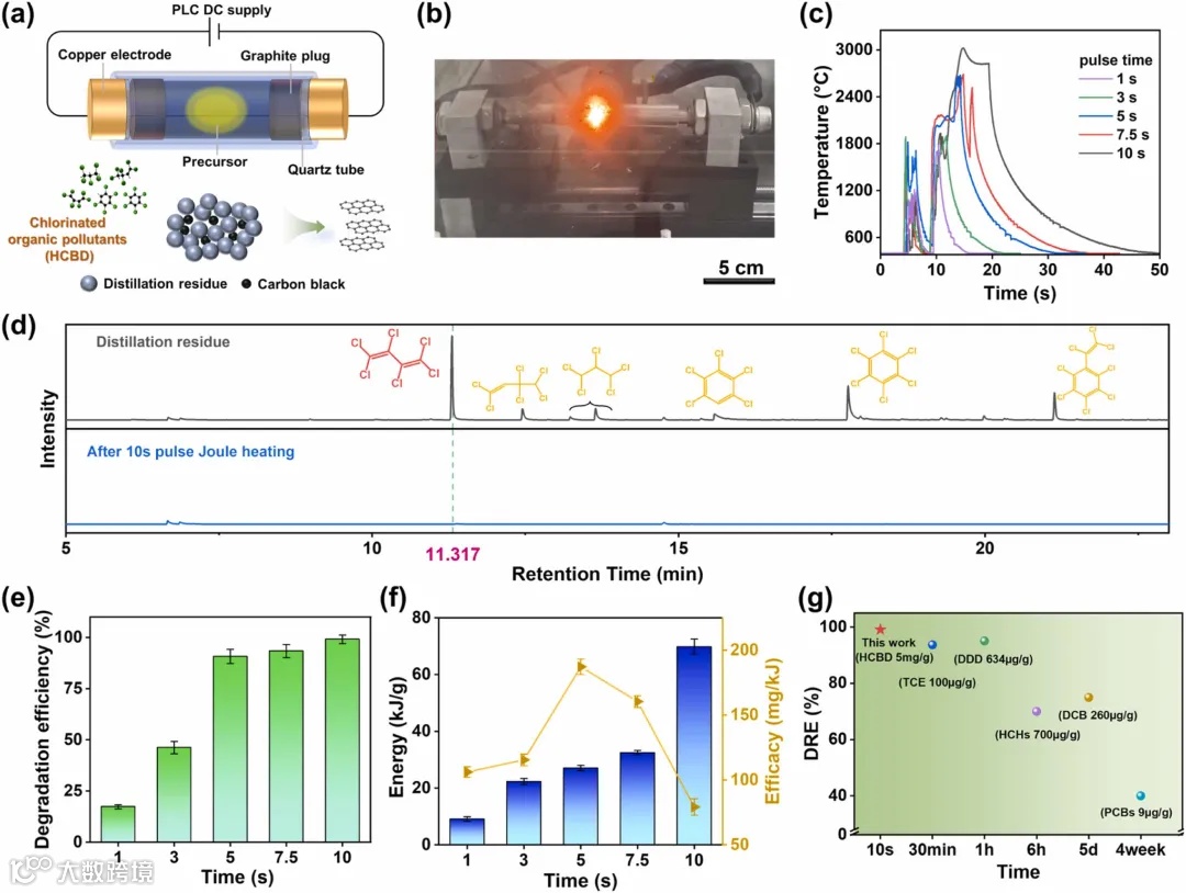 图2展示了实验中HCBD降解的具体过程,包括PJH反应器的示意图(图2a)及气相色谱-质谱(GC-MS)谱图(图2d),表明在经过10秒处理后,污染物完全降解。
