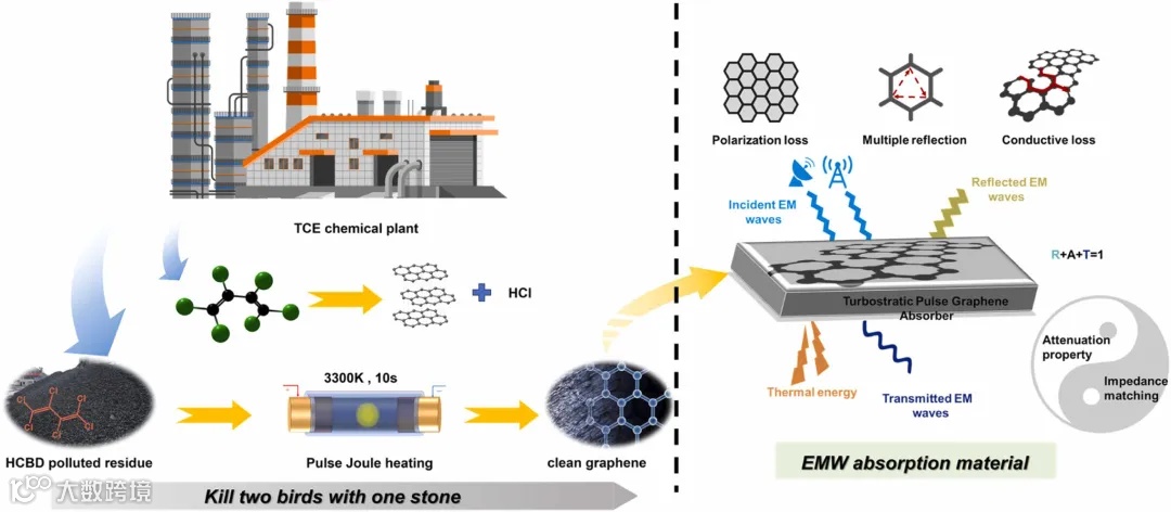 图1展示了脉冲焦耳加热(PJH)技术在HCBD污染蒸馏残渣转化为涡旋石墨烯(tPG)过程中的应用,突出其通过热冲击实现从有害废物到高附加值材料的转化。