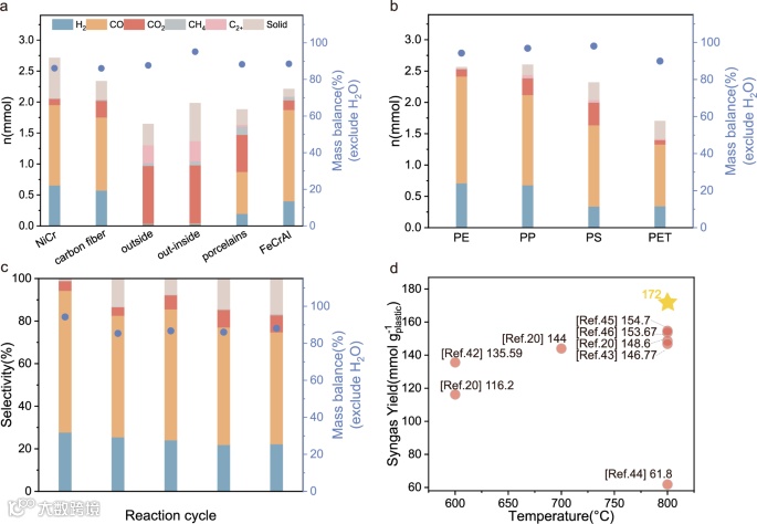 图3 展示了电催化重整体系在实际塑料产品中的应用和放大实验结果。图3a展示了使用电催化重整体系对实际塑料产品(移液器、洗涤瓶、口罩、午餐盒、食品容器、瓶子)进行二氧化碳重整反应的结果。结果表明,电催化重整体系能够有效地将各种塑料转化为合成气。图3b展示了放大实验的结果,结果表明电催化重整体系具有良好的放大潜力,能够实现大规模的塑料废物和二氧化碳转化。