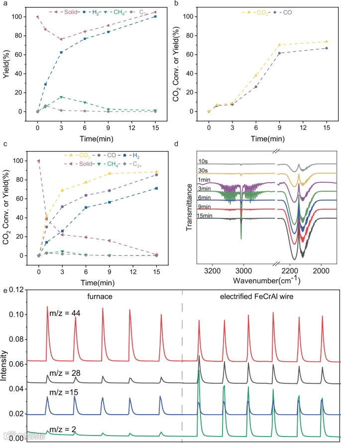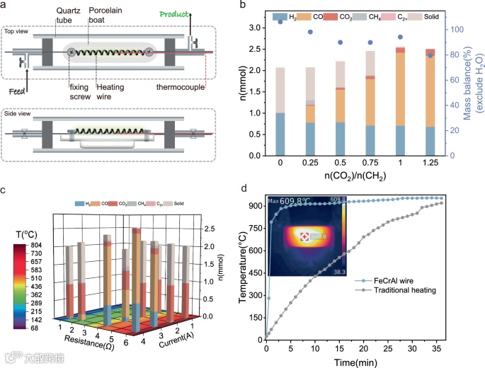 图1 展示了本研究中使用的电催化重整反应器的设计和反应条件筛选过程。该反应器由石英管、FeCrAl加热丝、瓷舟和密封装置组成。图1a展示了反应器的示意图,其中FeCrAl加热丝作为关键组件,通过通电产生高温,促进塑料和二氧化碳的反应。图1b展示了不同二氧化碳与聚乙烯摩尔比下,反应产物的分布情况。结果表明,随着二氧化碳比例的增加,一氧化碳的产量增加,碳沉积物的质量减少。图1c展示了不同电流和电阻值下,FeCrAl加热丝的电阻和电流变化对反应产物的影响。结果表明,选择合适的电流和电阻值对于提高一氧化碳和氢气的产量至关重要。图1d展示了FeCrAl加热丝与传统管式炉的加热速率对比,结果表明FeCrAl加热丝具有更快的加热速率,能够有效节省能源。