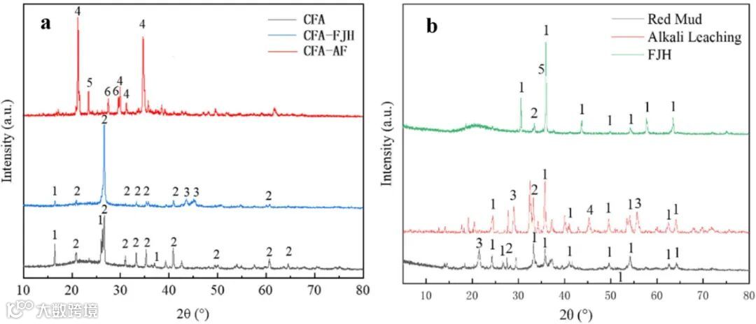 图 5 的 XRD 分析展示了活化处理对矿物相的改造。粉煤灰经焦耳加热后,3Al₂O₃・2SiO₂峰减弱,SiO₂峰增强,表明硅铝酸盐发生了相变;赤