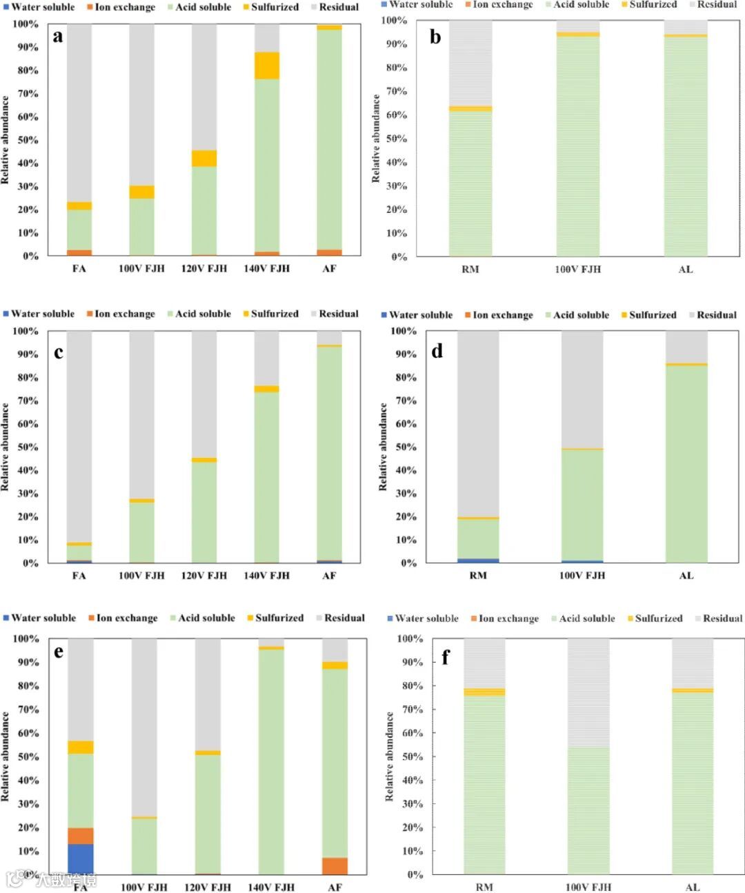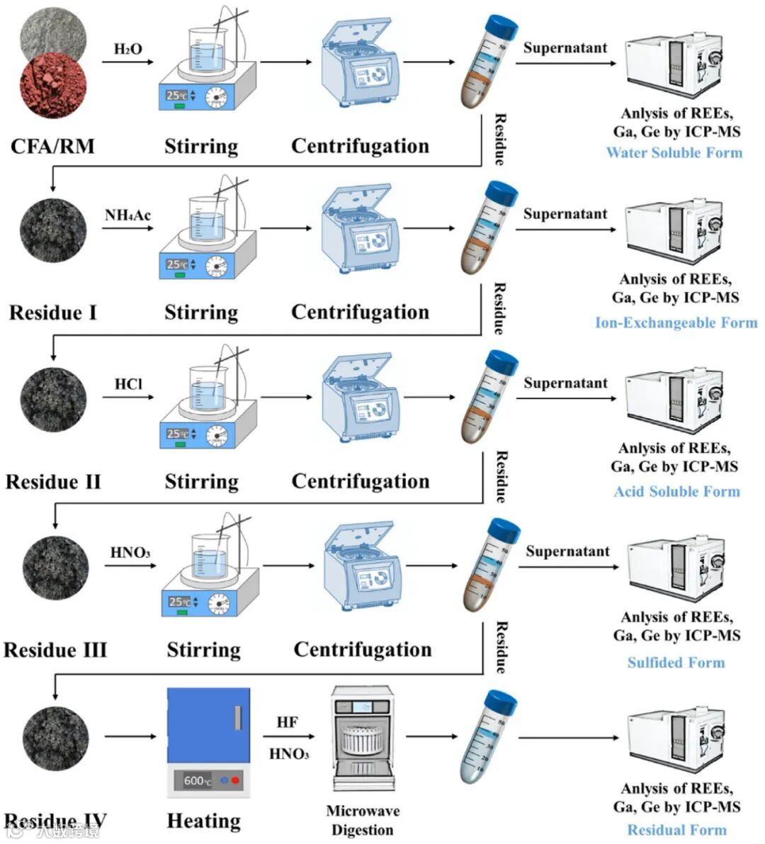 图 2 通过五步连续化学提取流程,展示了稀土与稀散元素在固废中的赋存形态分布。用水、醋酸铵、盐酸、硝酸和氢氟酸逐级溶解样品,分离出不同形态的组分,这种方法不仅量化了元素占比,比如酸溶态占比提升至 90%,还为教学实验提供了标准化的形态分析模板。
