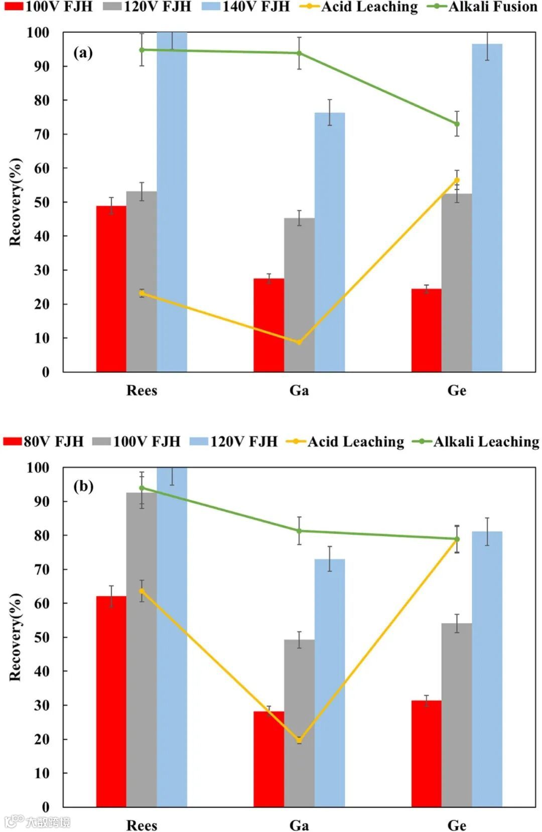 图 8 对比了焦耳加热与传统碱熔法的提取效率与能耗。焦耳加热使稀土提取率超过 95%,能耗仅为碱熔法的 1/3。虽然镓的提取率相对低一些(约 80%