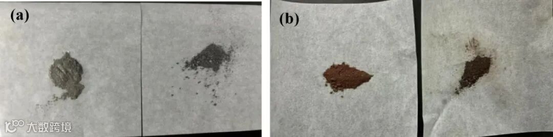 图 3 对比了焦耳加热前后粉煤灰与赤泥的宏观形貌变化。处理后的粉煤灰颜色从浅灰变成深黑,表面出现玻璃光泽的团聚体,赤泥从红棕色变成金属灰且呈现磁性,这些变化直观地证明了高温对硅铝 / 铁氧化物结构的破坏,为酸浸释放元素创造了物理通道。
