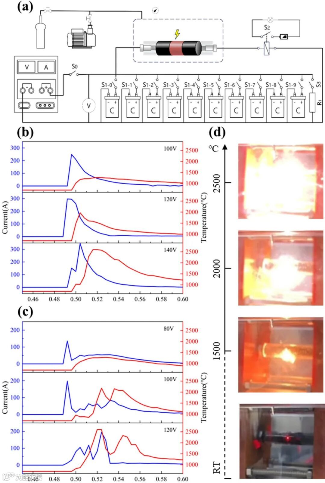 闪蒸焦耳加热(FJH)系统的核心结构与动态响应特性通过图 1 呈现。图 1a 的设备示意图显示,通过电容放电在石英管内瞬间释放大电流,能让样品在 0.1 秒内升温至 2600℃。从图 1b 和 1c 可以看到,粉煤灰与赤泥在不同电压下的电流 - 时间曲线及温度变化。粉煤灰因刚性硅铝结构电流稳定(最高 350A),赤泥由于内部气体逸散导致电流波动(最高 200A),