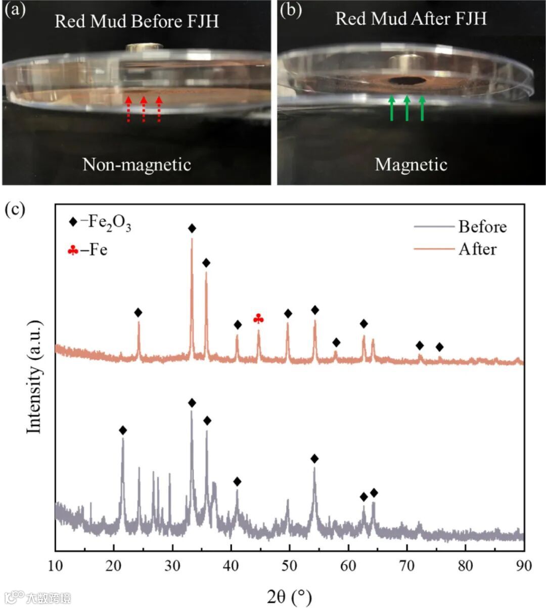 图 4 通过磁响应实验与 X 射线衍射(XRD)揭示了赤泥中铁的化学态转变。未处理的赤泥没有磁性,而经过焦耳加热后样品能被磁铁吸附,XRD 图谱进一步显示 Fe₂O₃特征峰消失,出现单质铁与 Fe₃O₄的新峰,这一发现为赤泥中铁资源的高效回收提供了新方向。