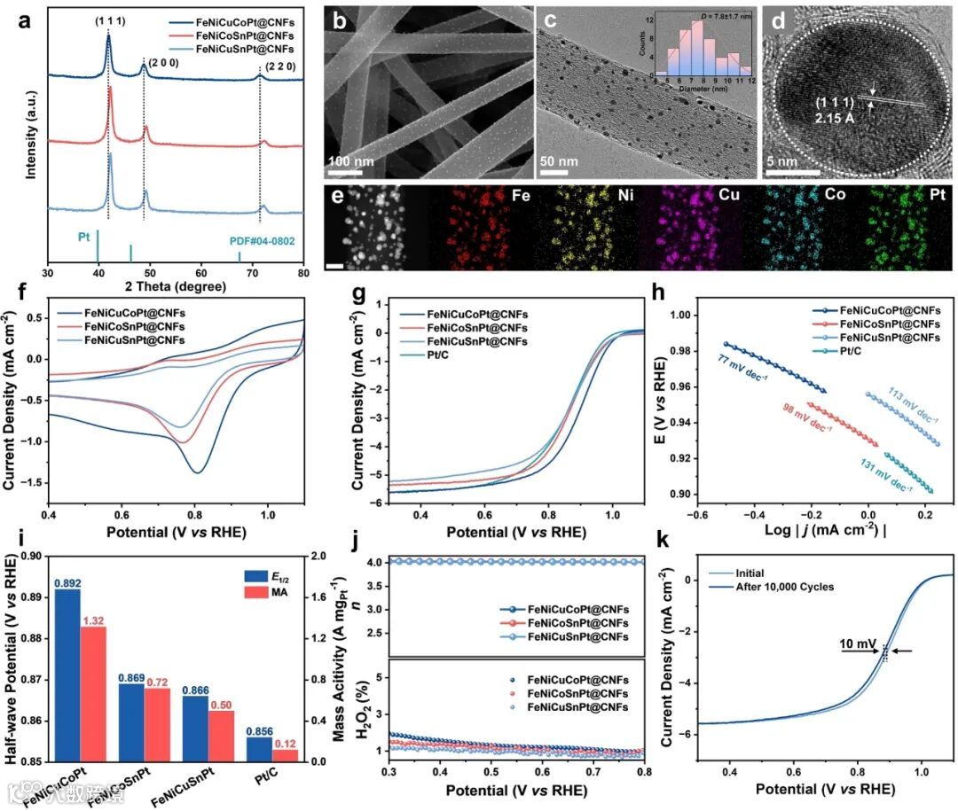 图 3:优势元素组合的验证:a 图 XRD 图谱确认三种 HEAs@CNFs 的 FCC 晶体结构;b - e 图通过多种显微图像和 EDS 映射展示纳米颗粒特性;f - h 图 CV、LSV 和 Tafel 曲线表明三种 HEAs@CNFs 催化性能优于商业 Pt/C;i 图比较半波电位和质量活性进一步证实优越性;j 图显示 ORR 过程涉及 4 电子转移;k 图 FeNiCuCoPt@CNFs 循环 10,000 次后仍具优异稳定性和活性。