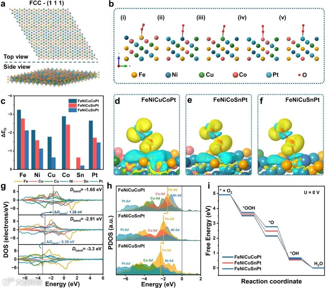 图 4:优势元素组合的解析:a 图展示 FCC HEA 晶面模型;b 图为 FeNiCuCoPt 表面 O2 吸附构型;c 图确定 Fe 位点为共同 ORR 活性位点;d - f 图差分电荷密度图分析电荷变化;g - h 图 DOS/PDOS 图表明 Cu 和 Co 协同效应是高活性关键;i 图自由能图显示 FeNiCuCoPt 在 ORR 中优势。