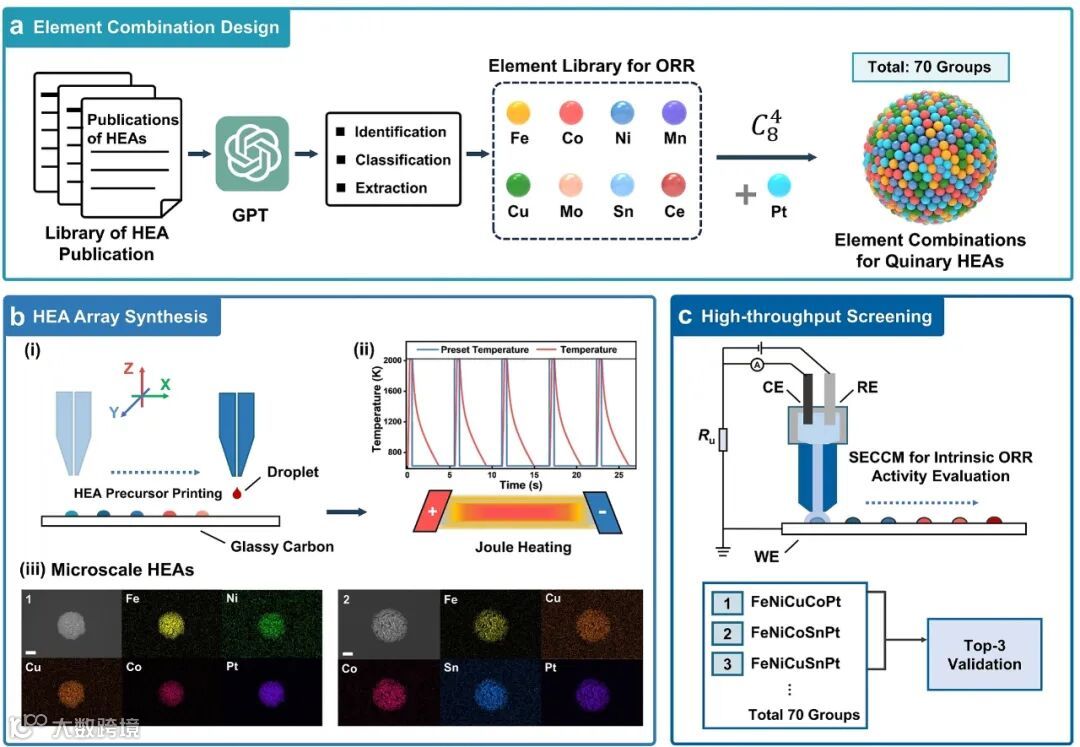 图 1:高通量实验流程:展示基于 Pt 基五元高熵合金的微尺度 ORR 电催化剂发现流程。a 图基于 LLM 设计元素组合,提取协调元素库;b 图通过微尺度前驱体打印和脉冲高温合成技术制备微尺度 HEAs;c 图利用 SECCM 筛选 ORR 活性,测量相对电流密度识别高活性组合。