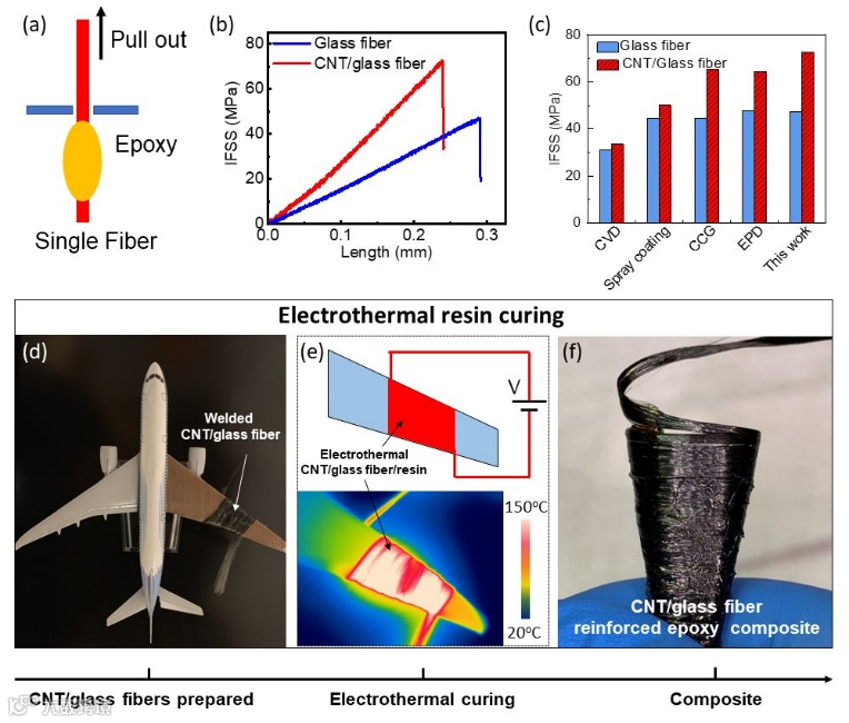 (b)玻璃纤维和CNT/玻璃纤维的界面剪切应力。