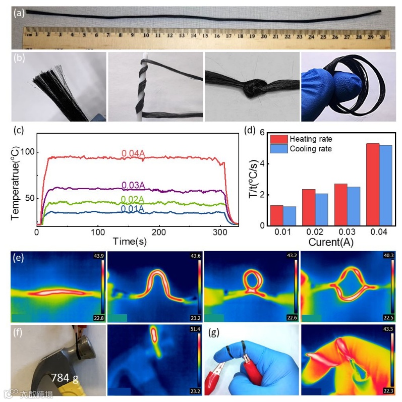 (g)缠绕在手指上的CNT/玻璃纤维焊接细丝的照片和红外图像,展示了其在可穿戴加热器件中的潜在应用。