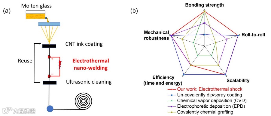 (a)焊接CNT/玻璃纤维的连续、连续生产的制造工艺示意图。
