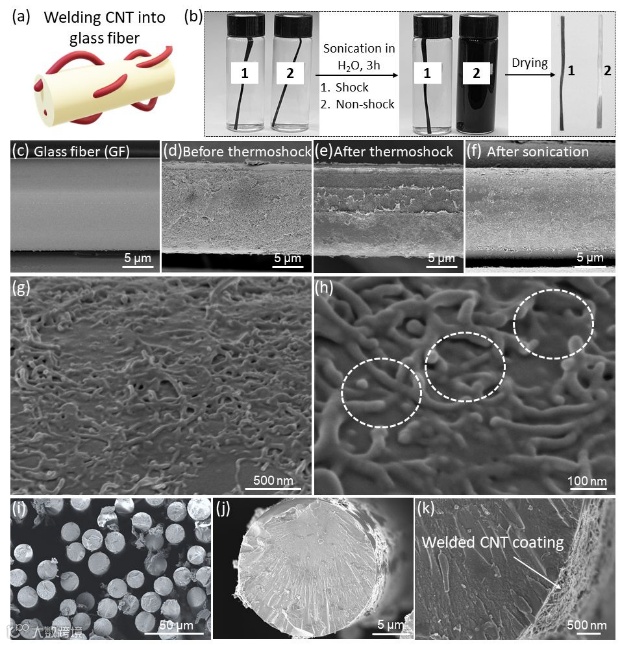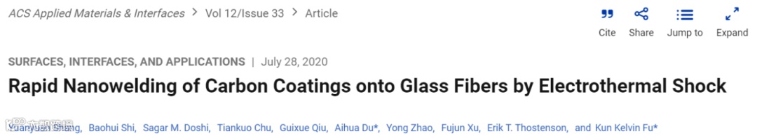 如何有效结合纳米材料与宏观结构一直是材料科学的难题。2020年,特拉华大学付堃教授与青岛科技大学杜爱华教授等人在*《ACS Appl. Mater. Interfaces》*发表了一篇重要研究,通过电热冲击技术在0.8秒内达到1050°C,实现了碳纳米材料与玻璃纤维的紧密焊接,为跨尺度制造带来了新的可能性。
