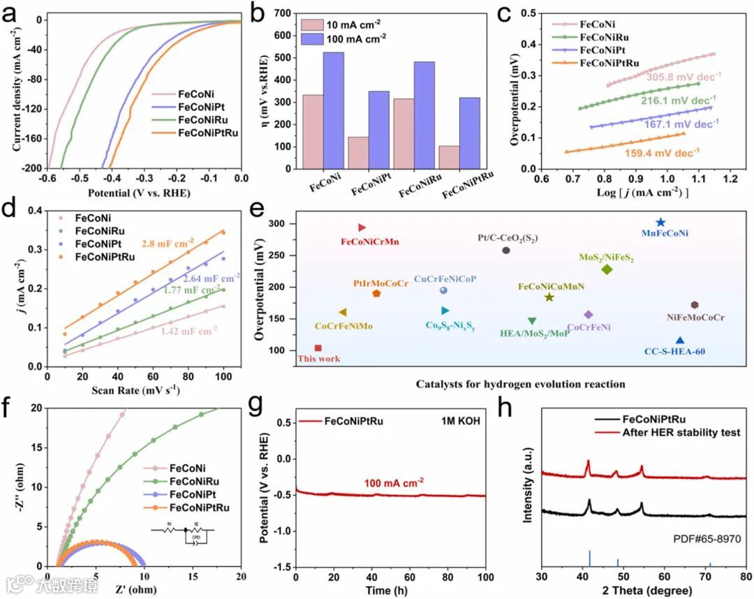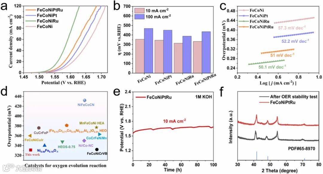 图3展示了FeCoNiPtRu催化剂在碱性介质中的析氢反应性能。与FeCoNi、FeCoNiPt和FeCoNiRu等催化剂相比,FeCoNiPtRu催化剂展现出更低的过电位和更优的动力学性能。在10 mA/cm²的电流密度下,FeCoNiPtRu催化剂的过电位仅为104 mV,且具有较低的Tafel斜率,表明其析氢反应过程更加顺畅。此外,该催化剂在100 mA/cm²的电流密度下连续运行100小时后,过电位仅略有下降,显示出优良的稳定性。