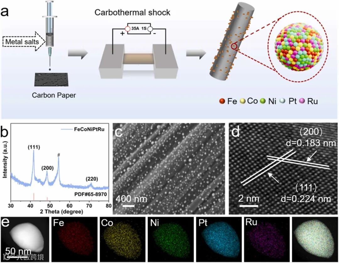 图1展示了FeCoNiPtRu高熵合金催化剂的合成过程。研究团队采用碳热冲击法在碳纸上涂覆金属前驱体,并在惰性气体氛围中进行加热和冷却,成功合成了FeCoNiPtRu高熵合金。XRD结果显示,催化剂主要呈PtCo相结构,伴有轻微的晶格畸变,归因于多种金属元素的混合与快速冷却过程。TEM图像显示,纳米颗粒均匀分散,平均粒径约为33 nm,表面被一层碳层包裹,这增强了催化剂与碳纸的结合力。