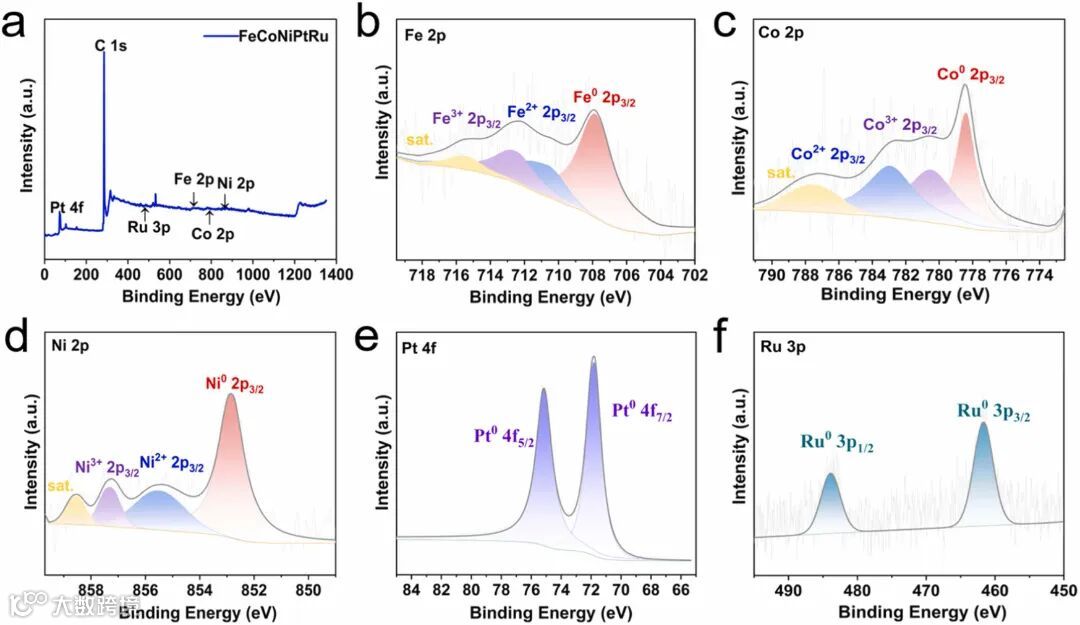 图2通过XPS分析催化剂的元素组成和价态,结果表明,FeCoNiPtRu催化剂由Fe、Co、Ni、Pt和Ru五种元素组成,并主要以金属态存在,伴有少量高价态,表明金属元素之间存在显著的协同效应。