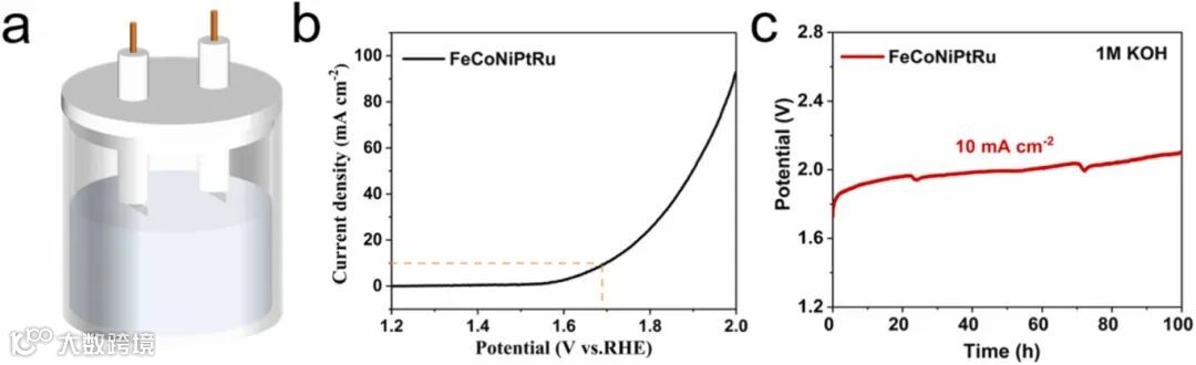 图5展示了FeCoNiPtRu催化剂在整体水分解中的应用。作为电解水全解过程的阴极和阳极,FeCoNiPtRu催化剂在10 mA/cm²下表现出1.69 V的电压,表明其高效的整体水分解能力。经过100小时的测试,该催化剂的性能稳定,进一步证明了其作为双功能催化剂的应用潜力。