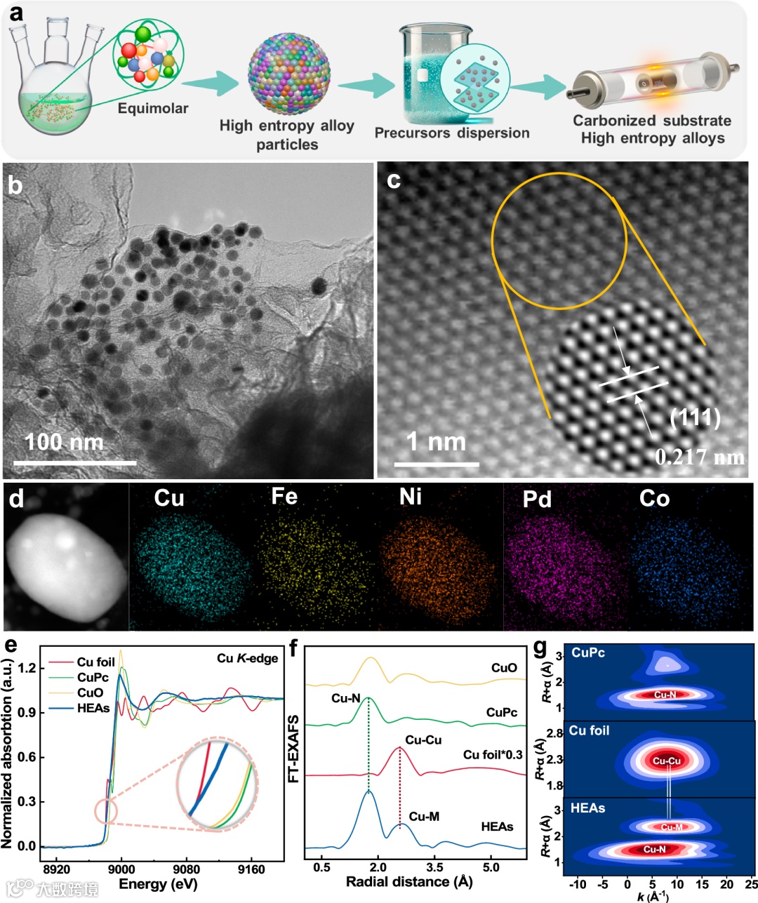 图a:展示了高熵合金催化剂的制备过程,从等摩尔比的金属前驱体到最终的碳基底高熵合金催化剂。