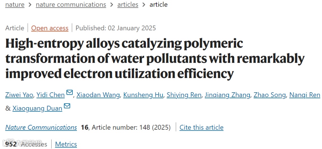 2025年1月2日,阿德莱德大学段晓光副教授和哈工大(深圳)陈以頔副教授在《Nature Communications》期刊在线发表了题为《High-entropy alloys catalyzing polymeric transformation of water pollutants with remarkably improved electron utilization efficiency》的研究论文。该研究提出了一种新型高效催化技术,利用含氮碳材料负载的CuPdFeCoNi合金纳米颗粒(HEA-NPs)催化过一硫酸盐(PMS)降解水中的有机污染物,为水污染治理提供了创新的解决方案,展示了在环境保护和废水处理中的广泛应用前景。