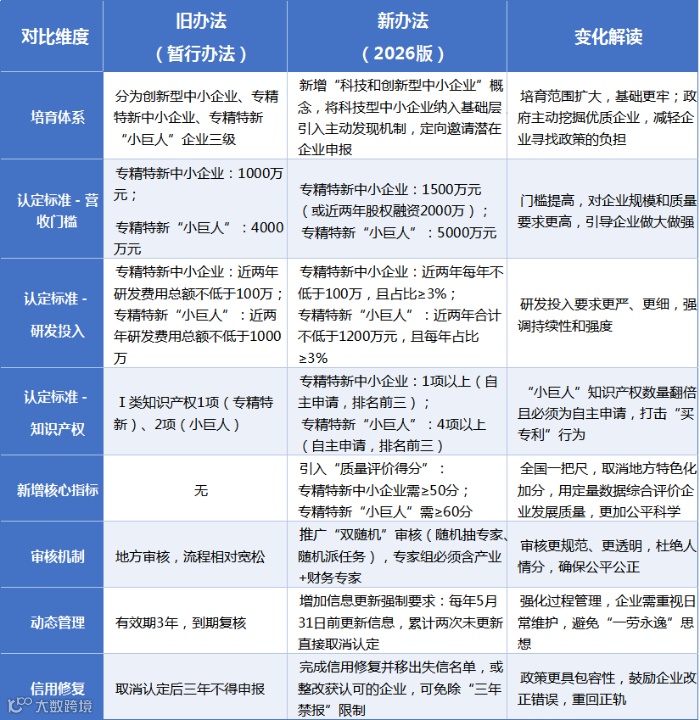 导语:2026年4月1日起,新版《优质中小企业梯度培育管理办法》(以下简称“新办法”)将正式实施!相比旧版暂行办法,新办法在认定标准、培育体系、动态管理等方面均有重大调整。以下我们将深度梳理新旧政策差异,并针对企业申报痛点提供实操建议。