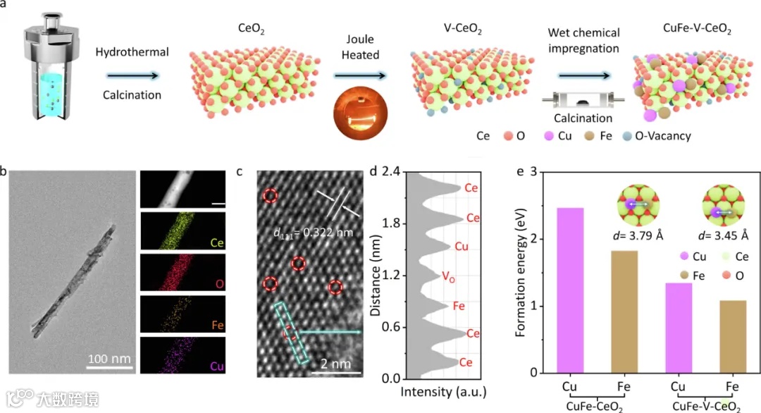图1展示了CuFe-V-CeO2纳米棒的合成过程,包括水热法制备CeO2纳米棒,并通过焦耳加热和湿法浸渍方法引入氧空位及铜、铁原子。透射电子显微镜(TEM)和能量色散光谱(EDS)分析表明Cu、Fe、Ce和氧元素均匀分布,支持了活性位点的有效利用。