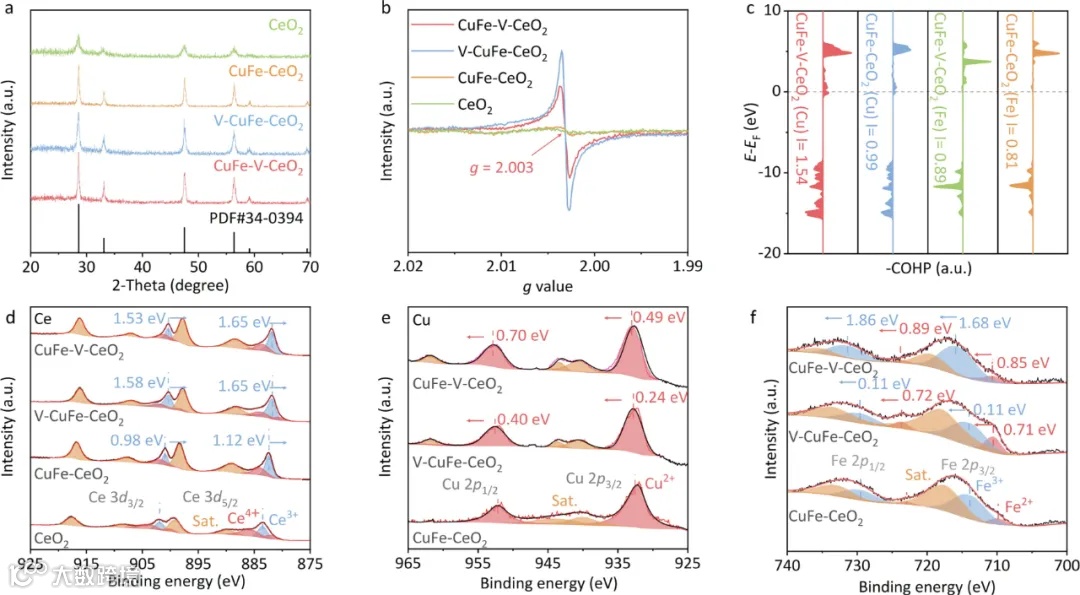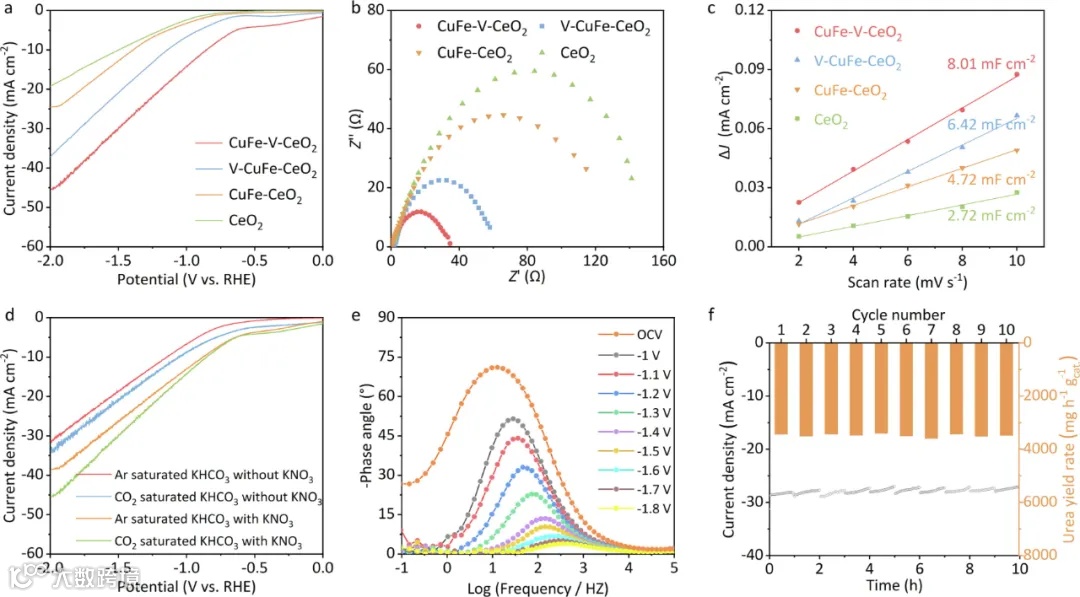 图4:CuFe-V-CeO2的电化学性能图4展示了CuFe-V-CeO2在电化学尿素合成中的卓越表现,包括最高电流密度和较低的电化学阻抗(Rct)。EIS和CV测试表明,氧空位引入增强了催化剂的电子转移能力。