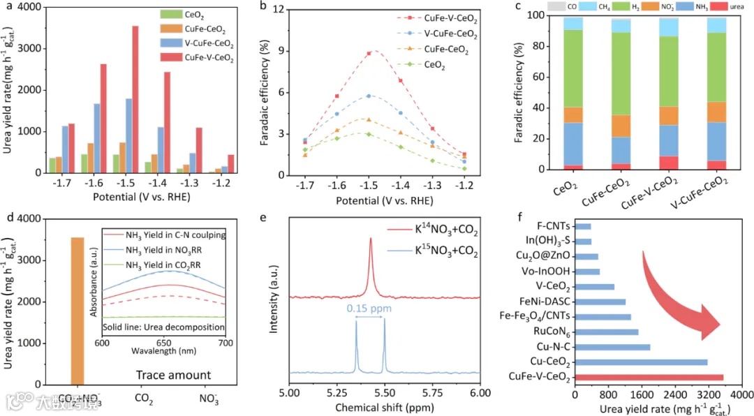 该研究采用焦耳加热技术在CeO2表面引入氧空位,这些氧空位成为铜和铁原子沉积的理想位点,从而最大化了原子的利用率,并形成了高效的尿素合成活性位点。经过优化,制备的CuFe-V-CeO2催化剂在-1.5 V相对于可逆氢电极(RHE)的电位下,展现出3553 mg h−1 gcat.−1的尿素产率,超越了目前已知的电催化尿素合成催化剂的性能。