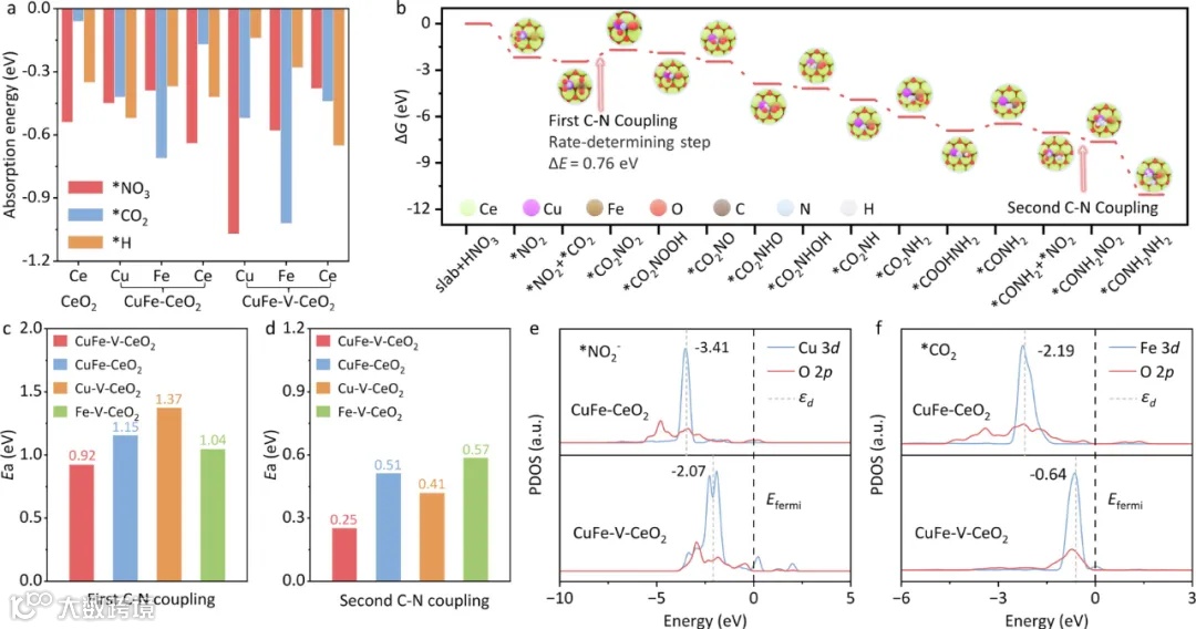 密度泛函理论(DFT)计算结果进一步揭示了该催化剂中Cu、Fe和Ce的协同效应,表明氧空位引入金属原子后,能有效降低尿素合成的能量障碍,并显著提升C-N偶联的效率。这一发现为电催化尿素合成催化剂的设计提供了新的理论依据,也为处理硝酸盐污染和能源问题提供了潜在的解决方案。