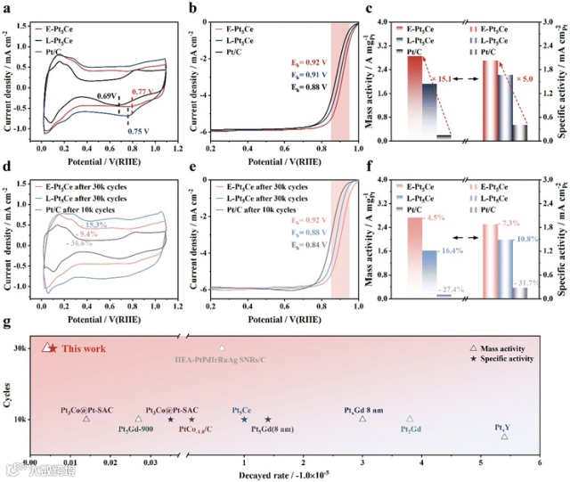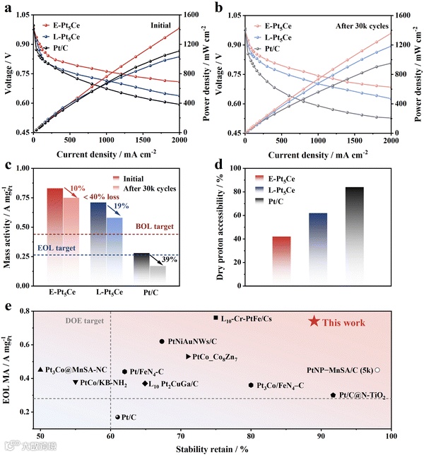 在燃料电池单电池测试中,E-Pt5Ce作为阴极催化剂展现了出色的性能,峰值功率密度(PPD)达1.42 W cm-2,接近美国能源部(DOE)2025年目标的两倍。经过耐久性测试,E-Pt5Ce的活性几乎没有损失,进一步验证了其在长期使用中的稳定性。