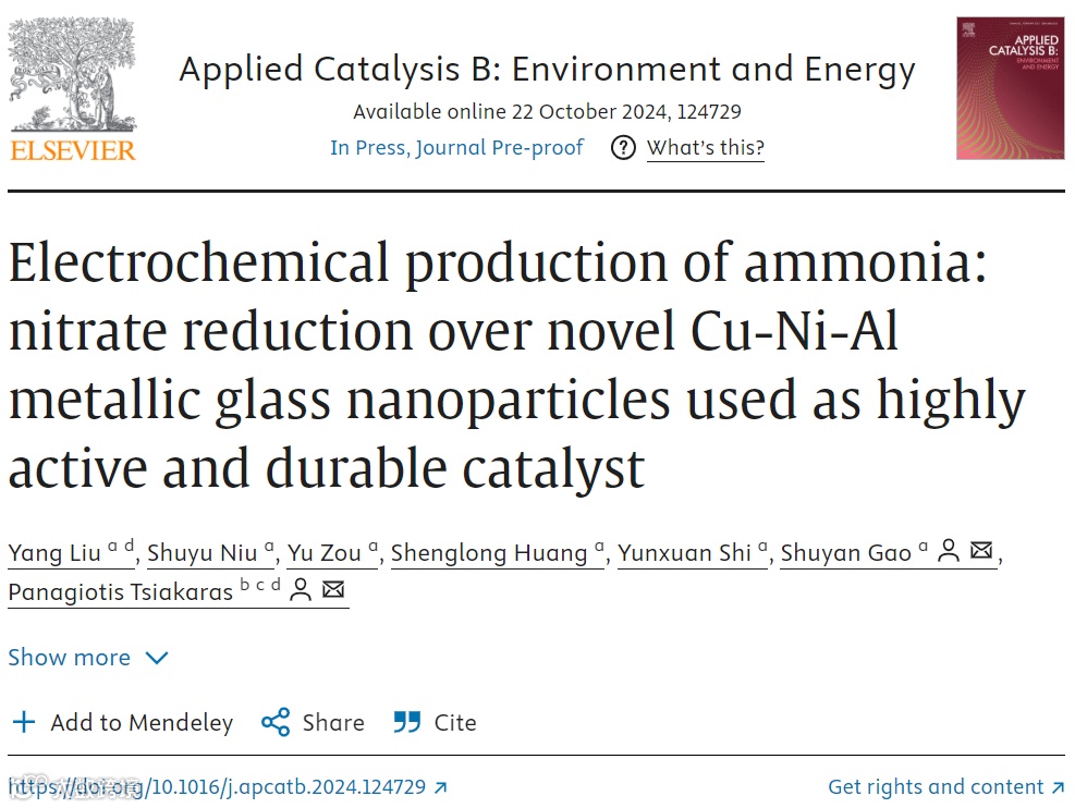 在全球对清洁能源需求不断增加的背景下,电化学合成氨(NH3)作为一种环保、高效的生产方法引起了广泛关注。传统的Haber-Bosch工艺能耗高、排放二氧化碳,因此开发绿色、可再生能源驱动的氨生产技术显得尤为重要。电化学还原硝酸盐(NRA)提供了一种可行的替代方案,但开发高效催化剂以调节反应中的吸附和脱附过程仍然是一个挑战。2024年10月22日,河南师范大学高书燕教授团队与希腊色萨利大学的Panagiotis Tsiakaras教授合作,在《Applied Catalysis B: Environment and Energy》上发表了相关研究,提出了新型Cu-Ni-Al纳米金属玻璃催化剂。