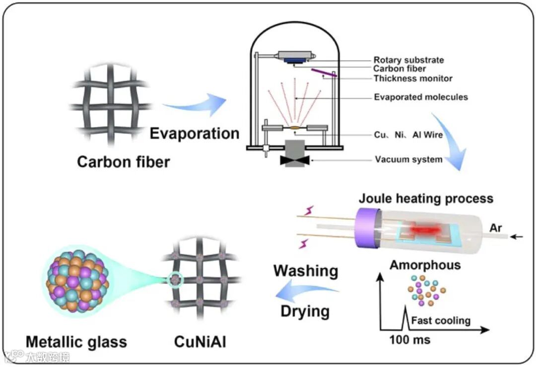 研究采用热蒸发和焦耳加热相结合的方法制备Cu50Ni25Al25催化剂,流程图展示了从金属丝到非晶态结构的完整合成过程。