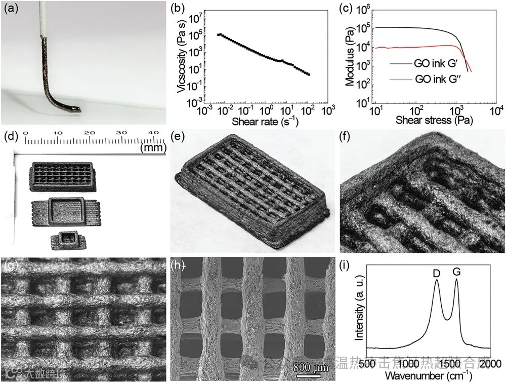 图2展示了GO墨水的流变性质和3D打印反应器的形态结构,证明了墨水的非牛顿流体特性和3D打印结构的稳定性。SEM图像(图2h)和拉曼光谱(图2i)进一步揭示了3D打印r-GO反应器的微观结构和石墨烯的无序程度,这对于实现有效的焦耳加热至关重要。