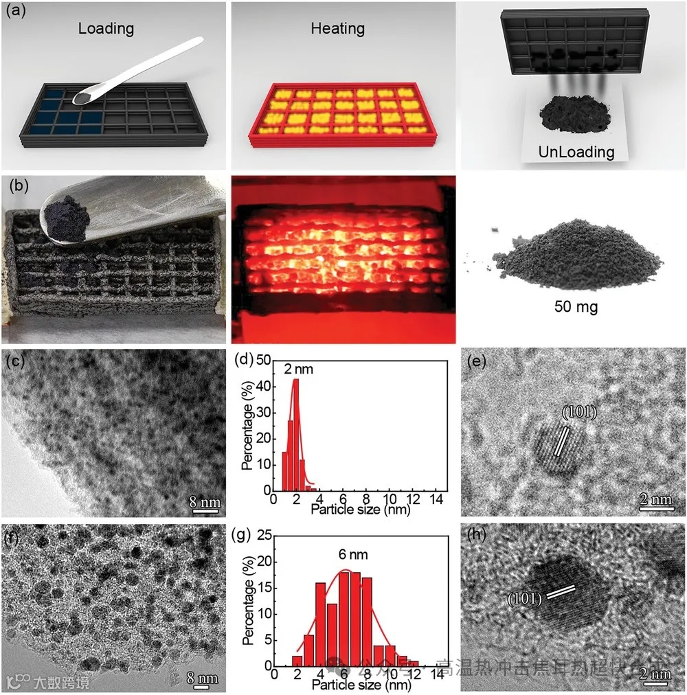 图4展示了使用3D打印微型反应器批量合成支持纳米粒子的过程,包括前体装载、快速加热和样品卸载。特别是,研究人员在1500 K下利用r-GO反应器合成了嵌入商业介孔碳CMK-3通道中的Ru金属纳米粒子。通过与传统管式炉制备的Ru纳米粒子进行比较,如图4e至4h所示,研究人员的微型反应器能够快速高效地合成尺寸均匀的Ru纳米粒子,且分散性更好。