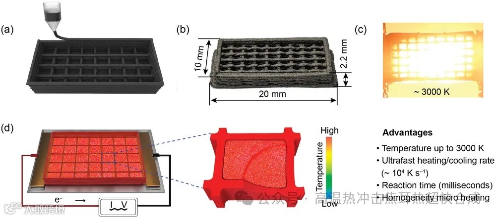 本研究中,研究人员成功展示了一种3D打印微型反应器,该反应器利用石墨烯氧化物(GO)的3D打印技术,制造出具有微尺度图案的多样化反应器形状,以实现局部和高效的加热。通过焦耳加热,该反应器能够快速升温至约3000 K,并保持高达10^4 K/s的加热速率,这为纳米催化剂的批量化和可扩展合成提供了一种全新的高效可控加热解决方案。