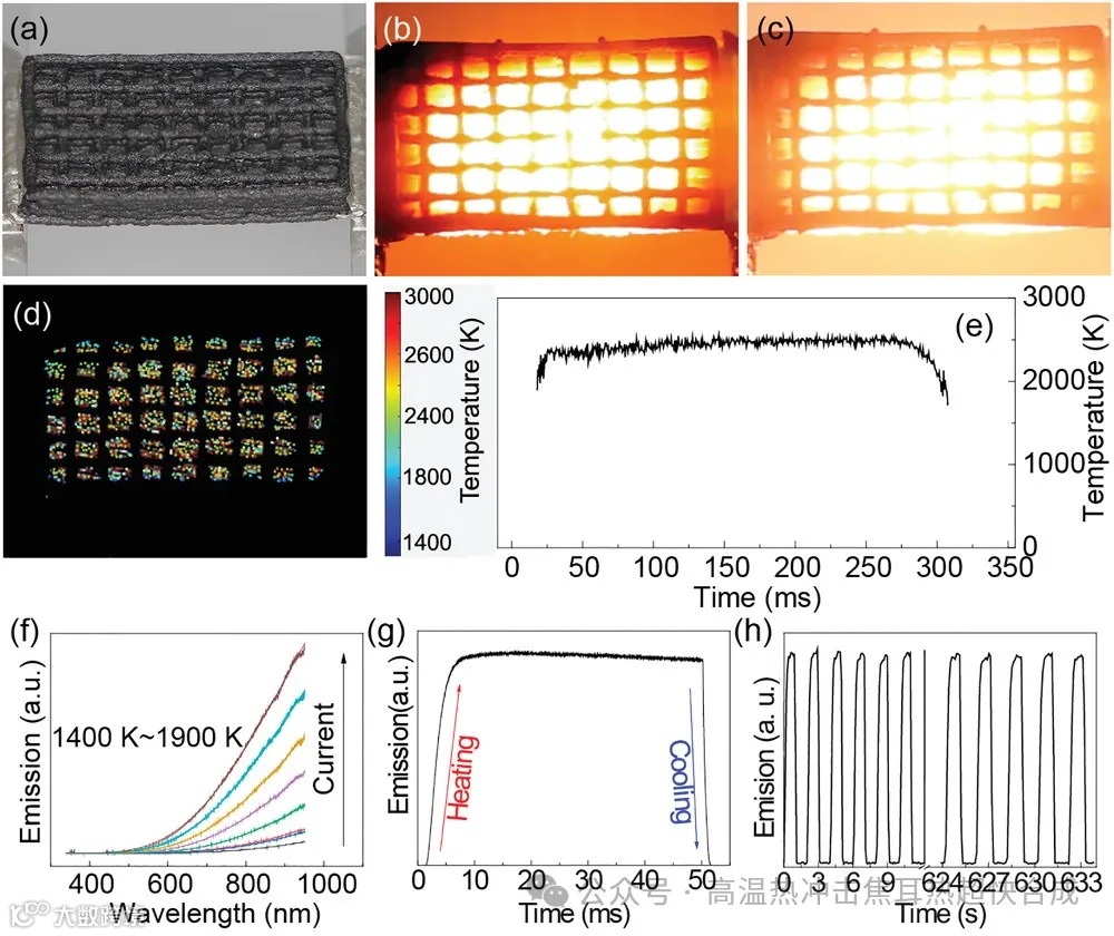为了探究反应器的加热能力,研究人员在图3a中展示了通过电焦耳加热实现的设备悬挂设置。图3b至3d进一步展示了不同电流脉冲下反应器的温度控制能力和空间温度分布,证实了反应器在毫秒级实现均匀加热的能力。此外,图3f至3h展示了反应器在不同输入电流下的辐射光谱和循环稳定性,证明了3D打印微型r-GO反应器作为高温反应器的卓越性能。