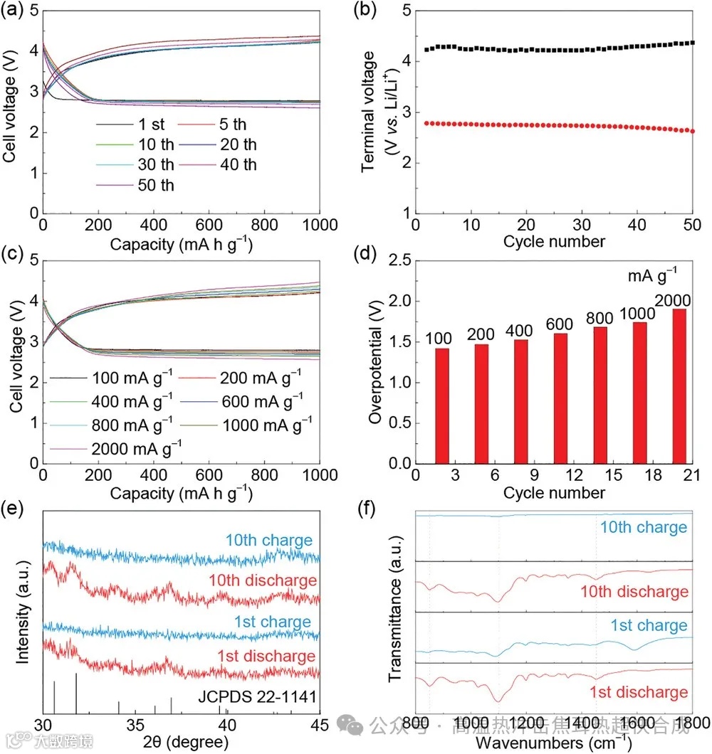 最后,图5展示了使用3D打印微型反应器获得的CMK-3中Ru纳米粒子作为Li-CO2电池阴极材料的电化学性能。这些Ru纳米粒子不仅降低了电池充放电过程中的过电位,还显著提高了能量转换效率,并且在循环稳定性和速率性能方面表现出色。XRD和FTIR谱图(图5e和5f)进一步证实了电池中Li2CO3的可逆形成和分解。