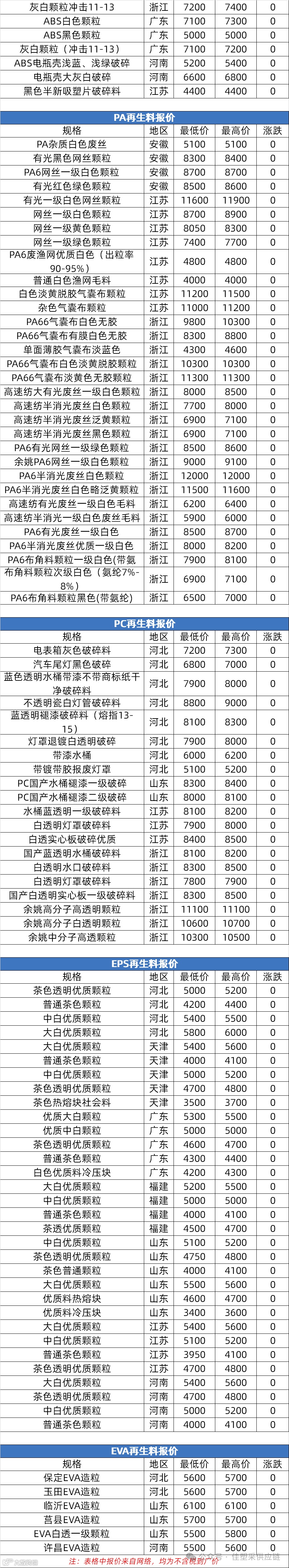再生塑料市场多呈平稳或震荡态势。再生PVC软硬质料多平稳盘整,成交清淡;再生PP期货高开震荡,短期弱势(华东拉丝6780-6950元/吨),再生料区间整理。再ABS多地报盘稳,需求疲弱,实单议价。再生PE价稳(山东 EVA 粒6000-6200元/吨),新旧料价差窄,需求弱,低位盘整。再生 PET 江浙稳、局部跌 100 元,供需博弈料偏弱;再生 EPS 稳为主,局部或小涨,环保有支撑。