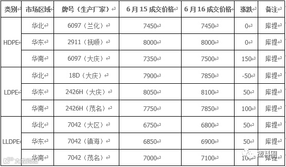 表1 我的塑料网(www.myplas.com)PE市场成交价格(单位:元/吨)