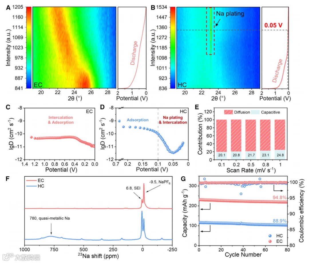 (C - D) EC 和 HC 的钠离子扩散系数(Ddiff):EC 在放电过程中扩散控制稳定,HC 在低电位有钠金属析出。