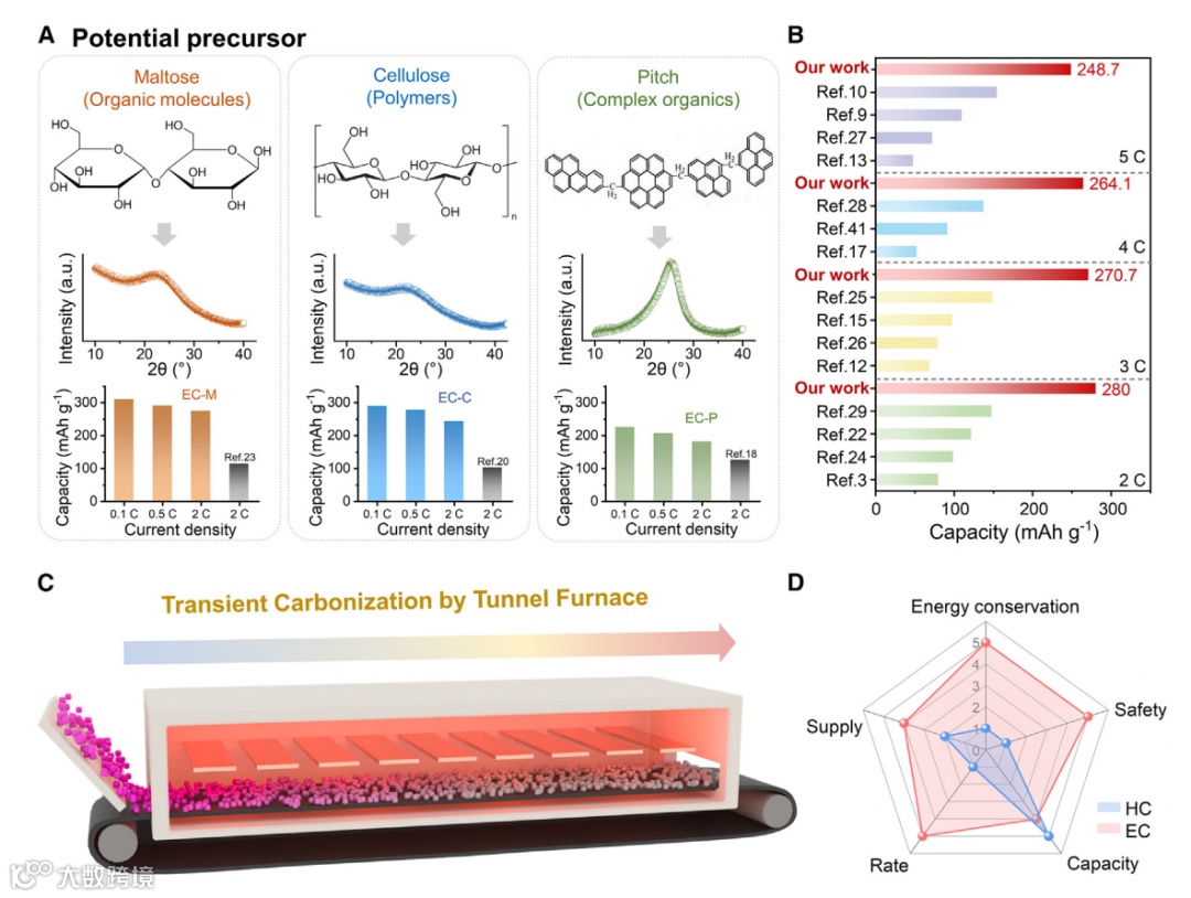 (A) 动力学解耦碳化合成的碳负极前驱体及其比容量:显示该方法对多种碳前驱体的适用性。