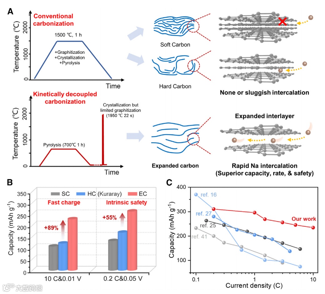 (B) 传统加热和动力学解耦策略下,碳负极在高倍率下的比容量:EC 在 5 C 倍率下容量达 241.6 mAh/g,高于传统加热制备的材料。