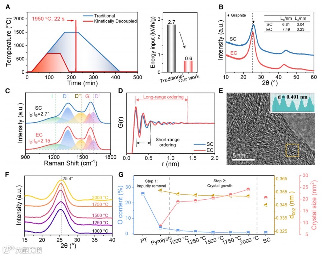 (A) 传统碳化与动力学解耦碳化的示意图:传统碳化中热解、结晶和石墨化过程紧密相连,难以单独调控;动力学解耦碳化则先低温(700°C)热解去杂质,再快速高温(1950°C,22 秒)加热促使碳原子重排。