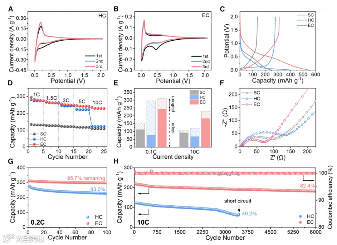(G - H) HC 和 EC 在 0.2 C(G)和 10 C(H)倍率下的循环稳定性:EC 在两种倍率下循环稳定性均显著优于 HC。