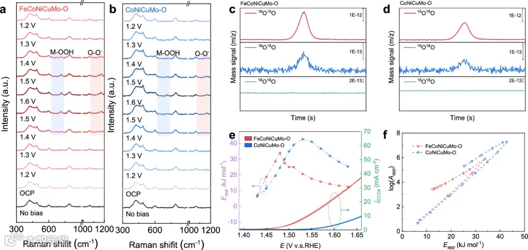 图3c-d:DEMS分析显示,FeCoNiCuMo-O在氧气标记实验中具有更强的氧同位素交换信号,证实了晶格氧机制的贡献。