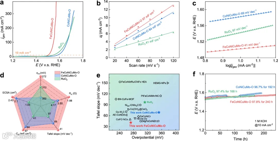 图2f:稳定性测试,表明FeCoNiCuMo-O在240小时后性能变化极小,证明其卓越的耐久性。